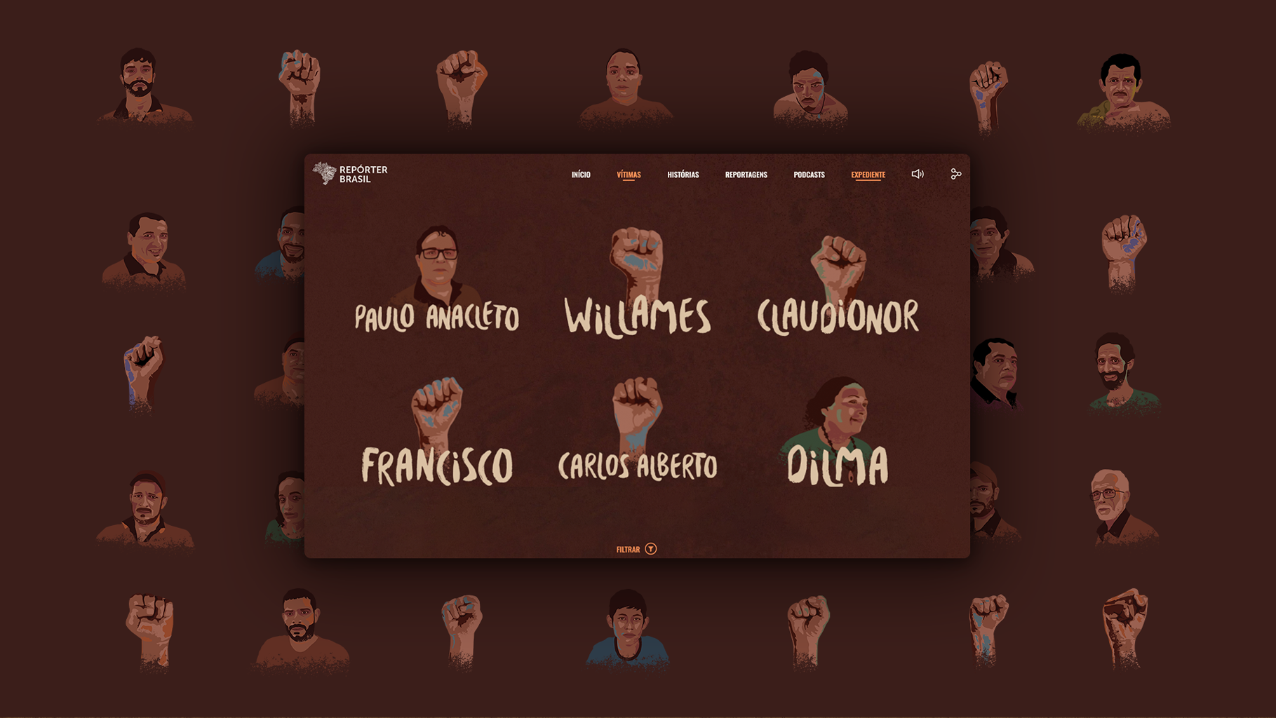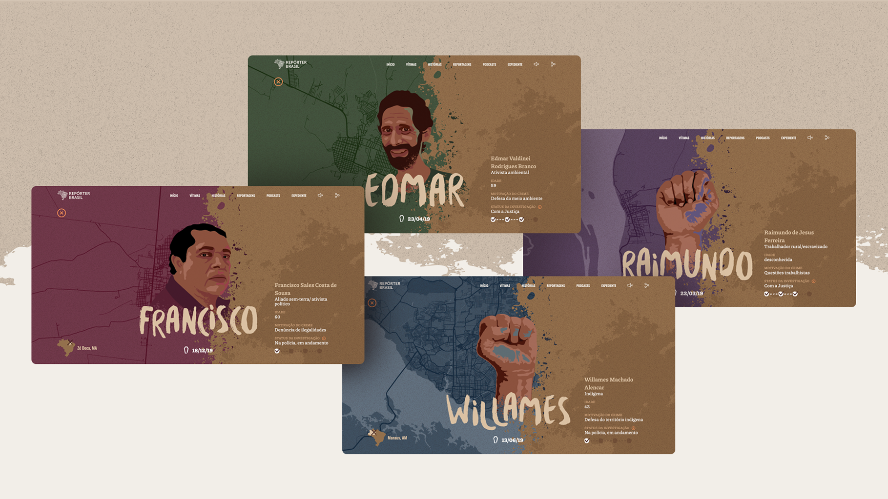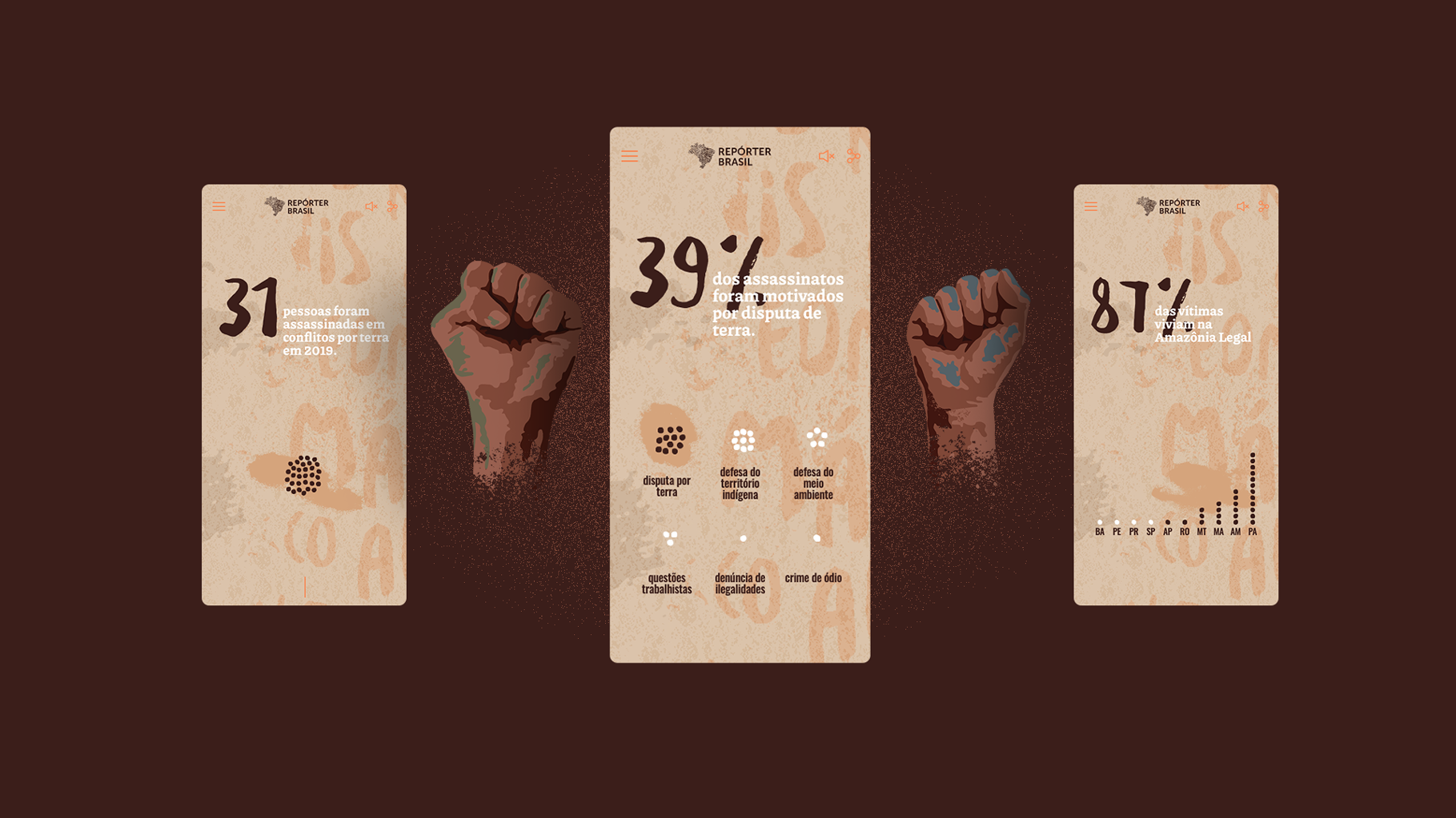 The multimedia special Cova Medida provides information from the report 'Conflicts in the Brazilian Countryside,' published annually by the Pastoral Land Commission. It tells the stories of victims of territorial disputes. The immersive project, a result of in-depth journalistic investigation, employs various resources such as sound, illustrations, transitions, and animations, allowing the reader to deeply understand this reality. Whether navigating through the profiles of the victims, reading articles, or listening to the podcast, the project draws on references from the very environment where the crimes were committed: the rural areas of the country. It incorporates tones and textures of soil, maps of the locations of the murders, handcrafted fonts, and original audio recordings of the victims' families."