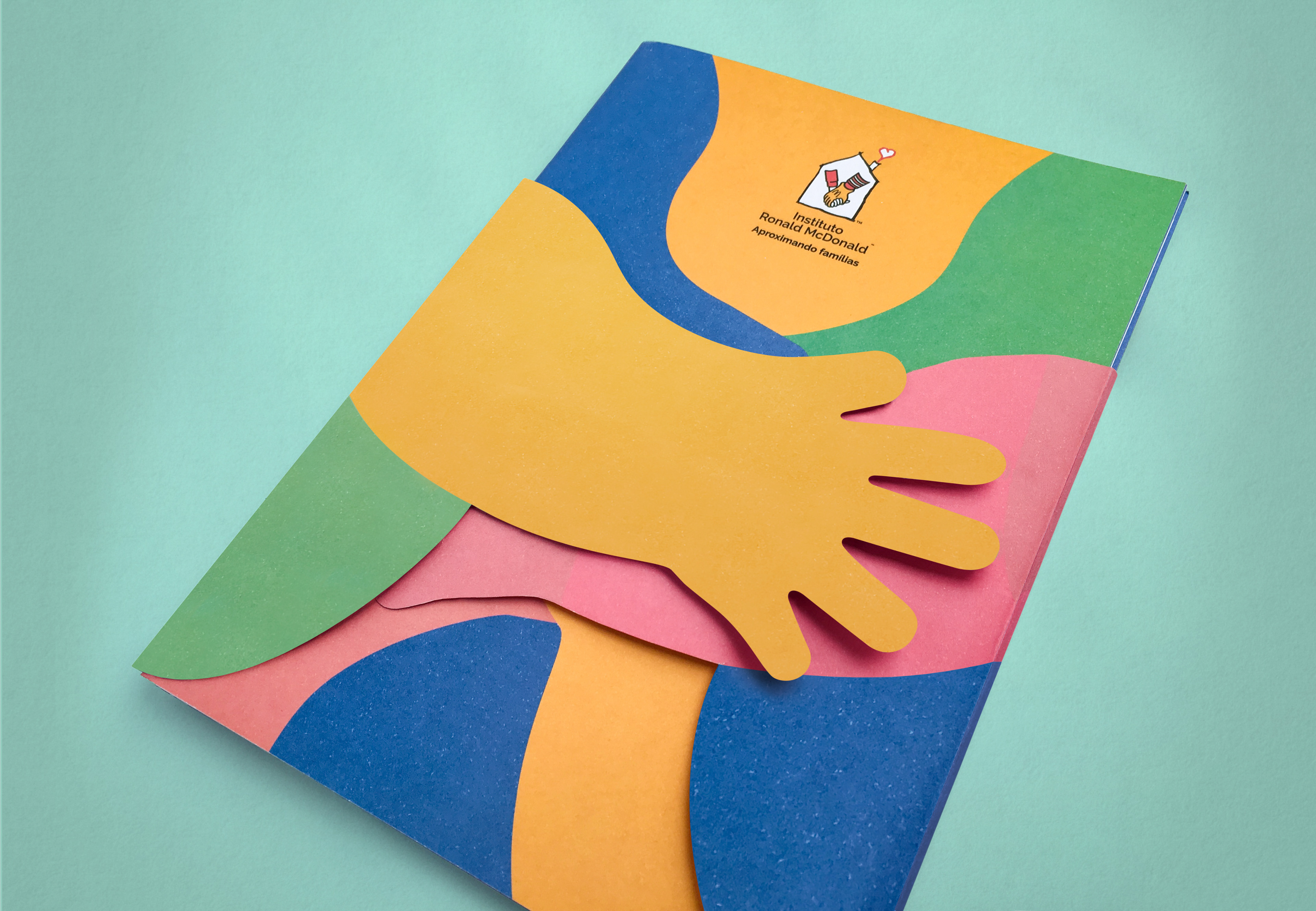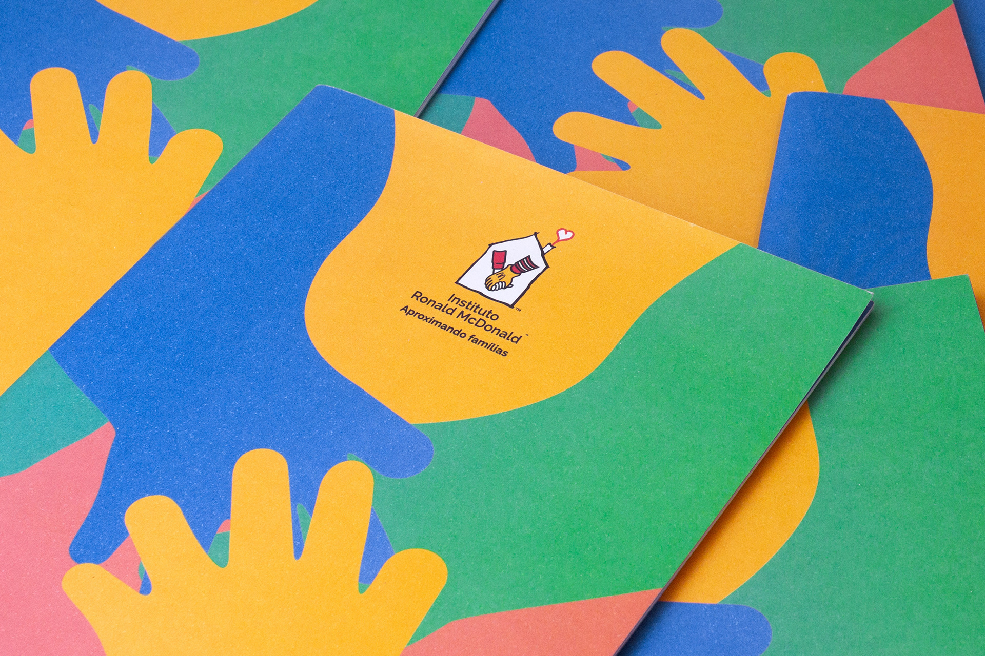 O produto digital é fundamental para disponibilizar em larga escala o conteúdo o Instituto Ronald McDonald, porém, em uma reunião presencial com um parceiro ou fornecedor um material impresso diferenciado faz toda diferença. A partir desta premissa, criamos um kit de reuniões, que consiste em um livreto com as principais informações do relatório de atividades, dois folders com informações complementares e uma cinta que abraça e organiza todo o material.
