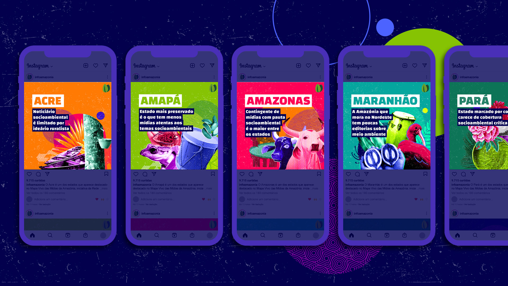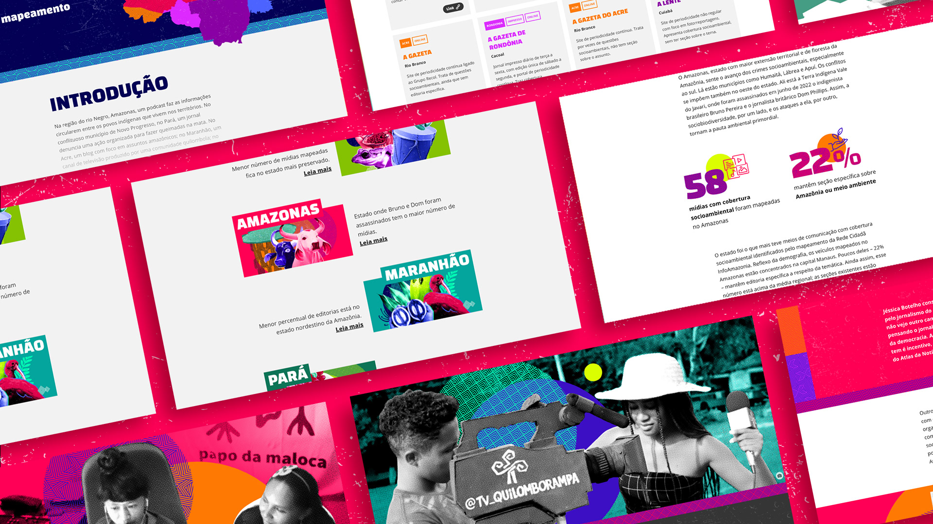 Mapeamento da Rede Cidadã InfoAmazonia, com foco em cinco estados brasileiros, identifica mídias locais que lançam olhar para temas como desmatamento, mudanças climáticas e comunidades tradicionais. Fomos chamados para trabalhar na identidade visual do projeto e para desenvolver o site do mapeamento. Usamos padronagens e cores inspiradas na expressão cultural dos estados que fazem parte do mapeamento.