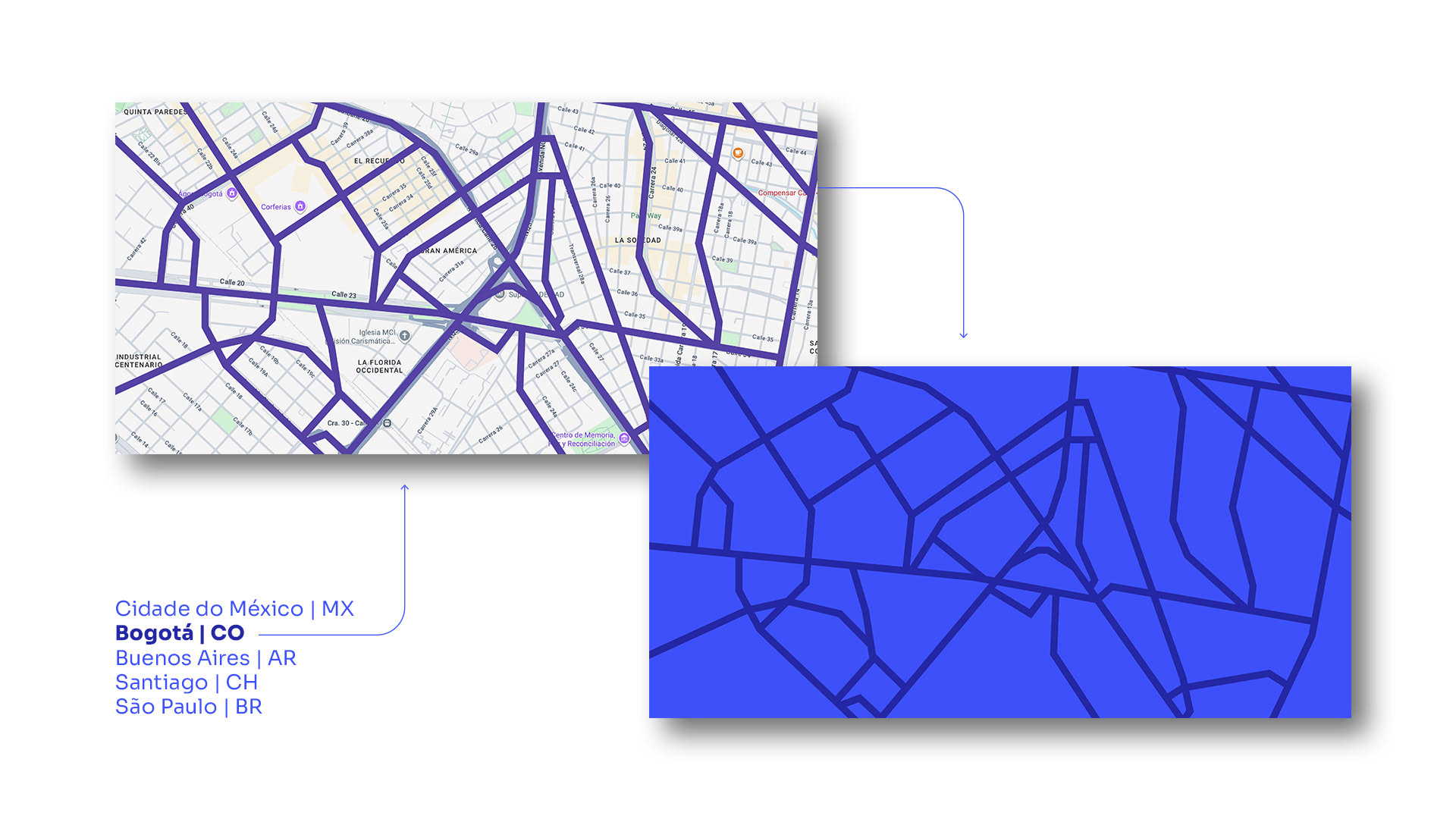Elaboramos grafismos baseados em mapas urbanos reais para criar uma metáfora visual — cada linha representa conexão, cada encontro simboliza apoio mútuo, em escala local e continental, integrando os produtos da pesquisa: relatório impresso, folder e website. Criamos também um sistema de mapas e cores para facilitar a identificação do país em discussão. Colagens de fotografias autênticas — nenhuma foto de banco de imagens ou IA — e elementos gráficos manuscritos, dão o tom humano do projeto.