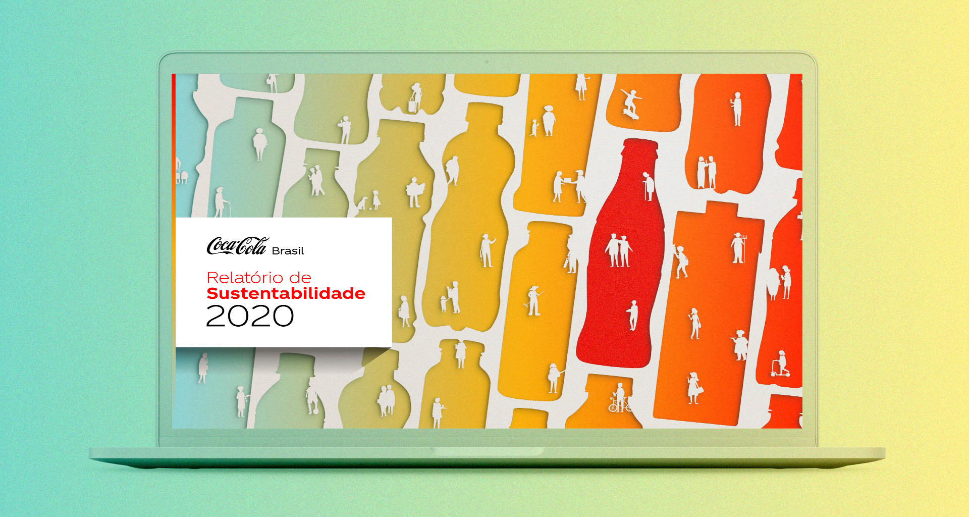 Relatório de Sustentabilidade 2020 da Coca-Cola Brasil. O projeto gráfico foi inspirado na reutilização de materiais reciclados, como papeis, plásticos, pet, entre outros. Além da diagramação, criamos ilustrações, gráficos e esquemas visuais para ajudar na compreensão dos dados apresentados.